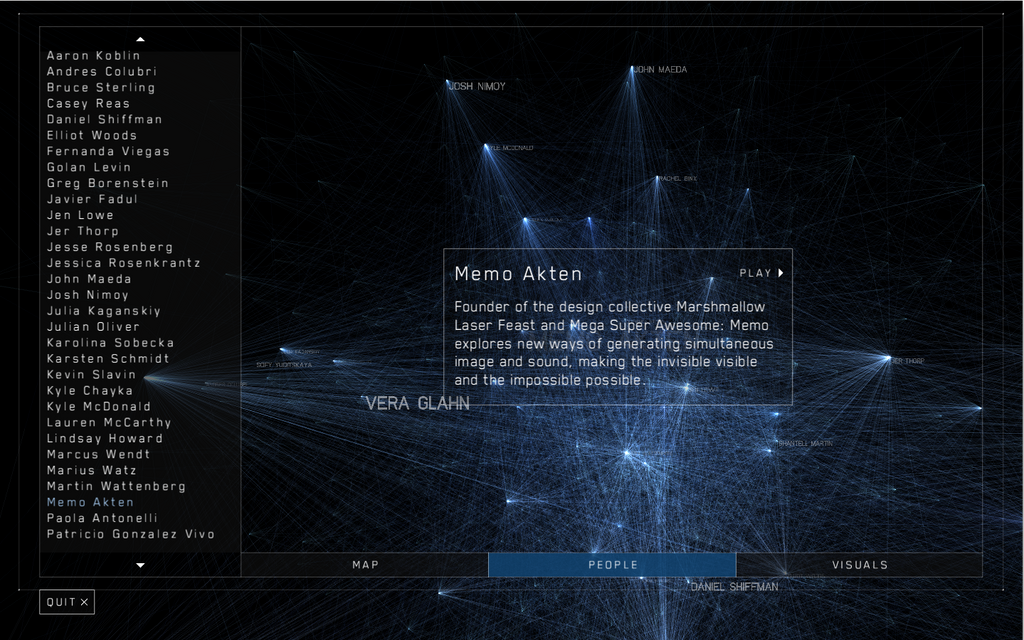 People featured in the film include 40 artists, designers and hackers who participate in the co-creation of free tools for creative expression: Processing and openFrameworks. Reflecting the story of these online communities, the software behind CLOUDS was built in C++ using openFrameworks, and includes real-time interactive visualizations by the artists featured in the documentary.